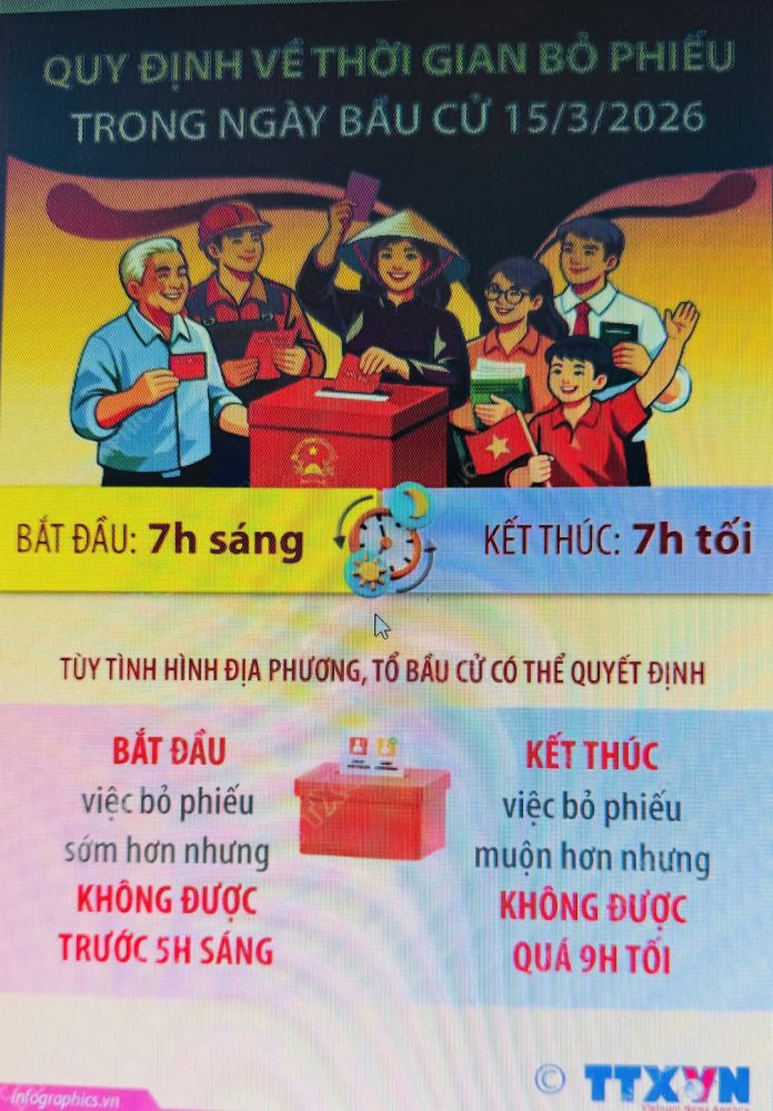 Ngày bầu cử đại biểu Quốc hội khóa XVI và đại biểu HĐND các cấp nhiệm kỳ 2026-2031 được ấn định là ngày 15/3/2026. Theo quy định, việc bỏ phiếu bắt đầu từ 7h sáng đến 7h tối cùng ngày. Tùy tình hình địa phương, Tổ bầu cử có thể quyết định cho bắt đầu việc bỏ phiếu sớm hơn nhưng không được trước 5h sáng hoặc kết thúc muộn hơn nhưng không được quá 9h tối cùng ngày.